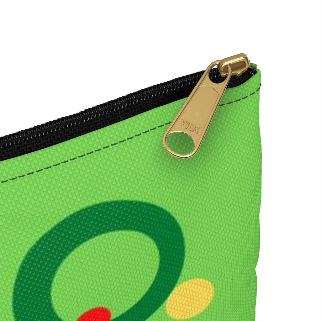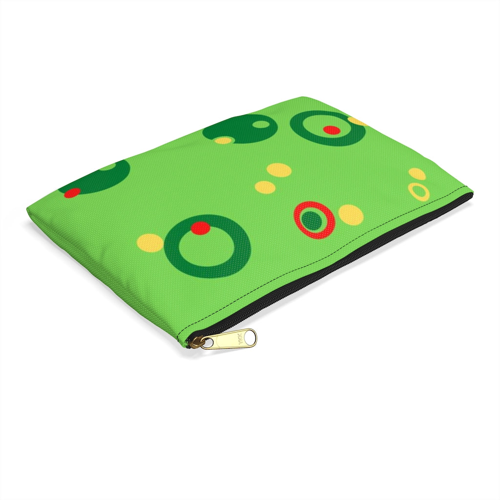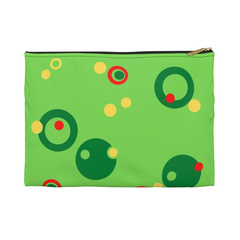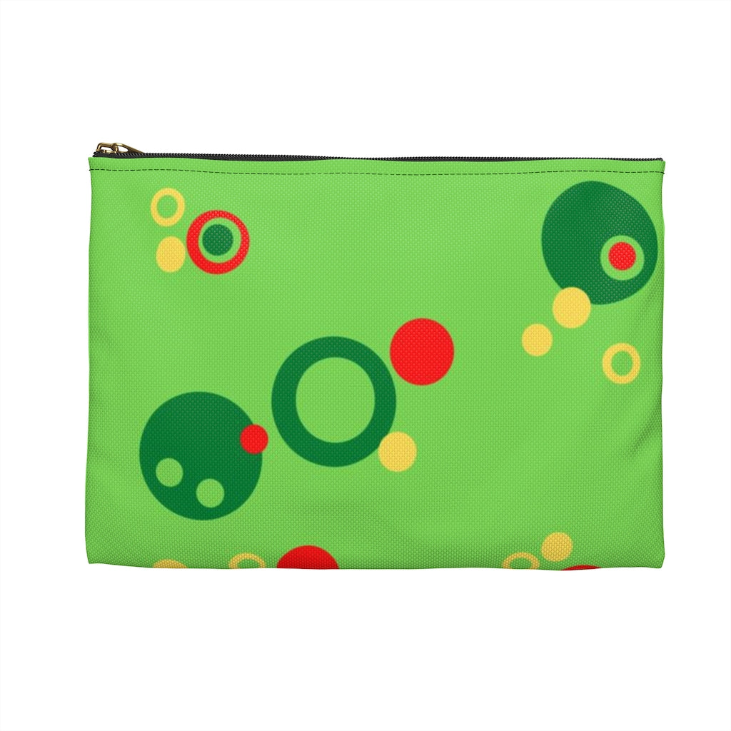 The green bubbles accessory pouch is perfect for pencils, cosmetics, change, or pretty much anything. It is made from durable polyester and also comes in blue or orange bubbles.