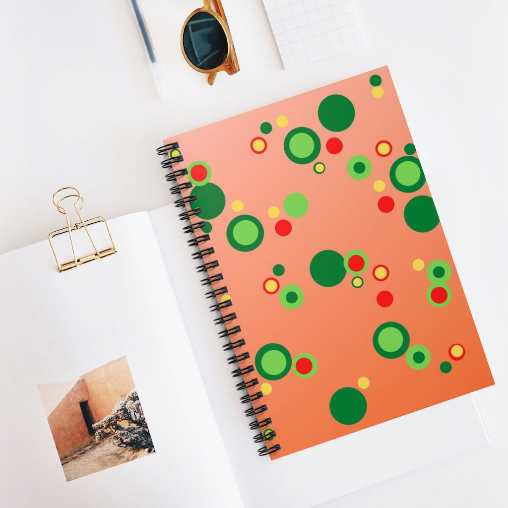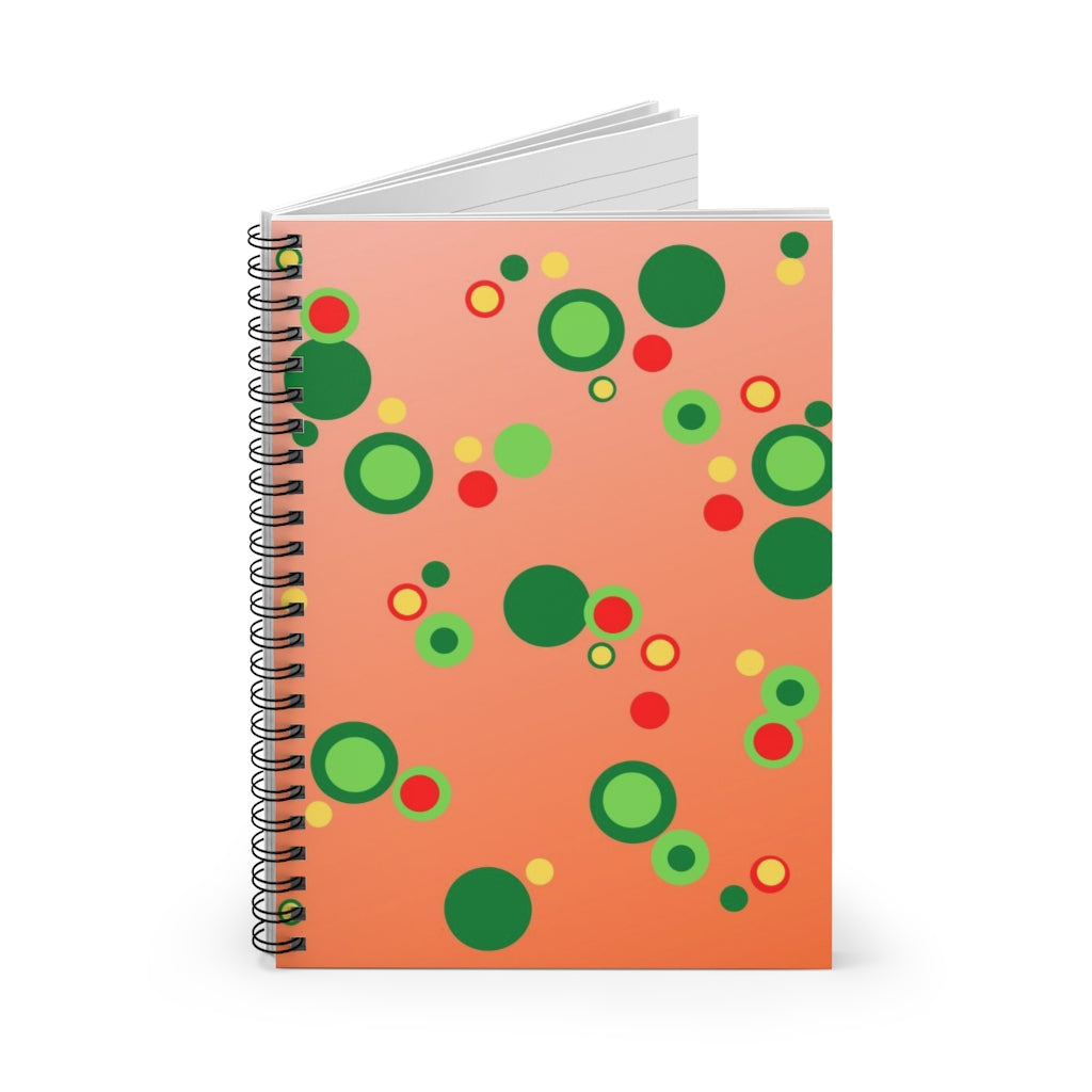 The orange bubbles spiral notebook is a colorful addition for school, shopping lists, or a place for thoughts and ideas. The 118 page notebook has ruled line pages and is also available in blue or green bubbles.